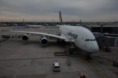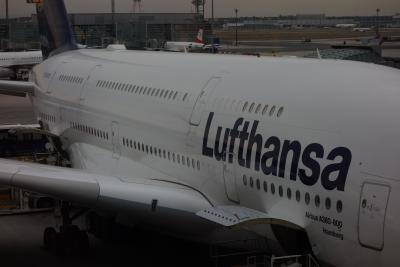 Dann geht es in den Flieger nach Frankfurt. Kurze 45 Minuten, dann landen wir schon wieder. In Frankfurt nur schnell umsteigen. Ab in den Airbus 380. Ein Riesenteil. Auch von aussen echt imposant.